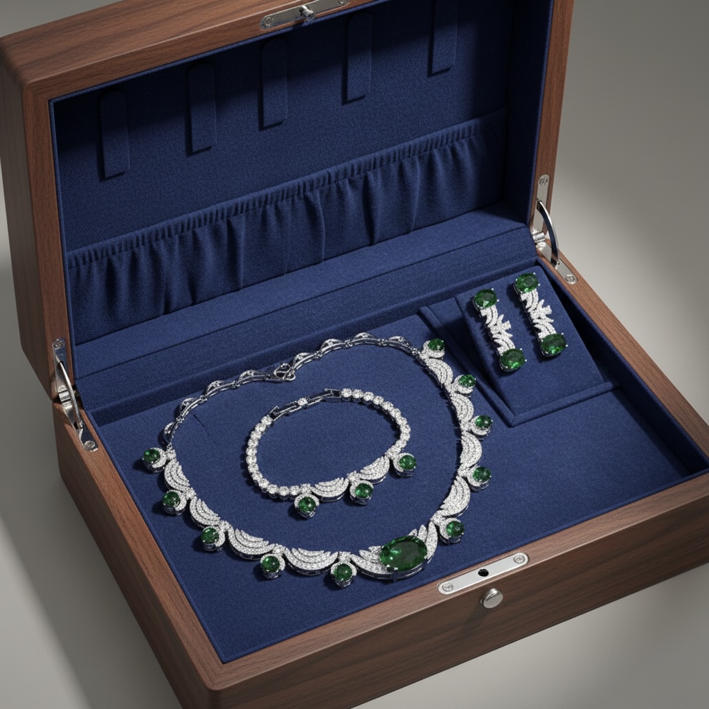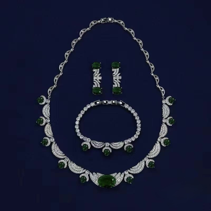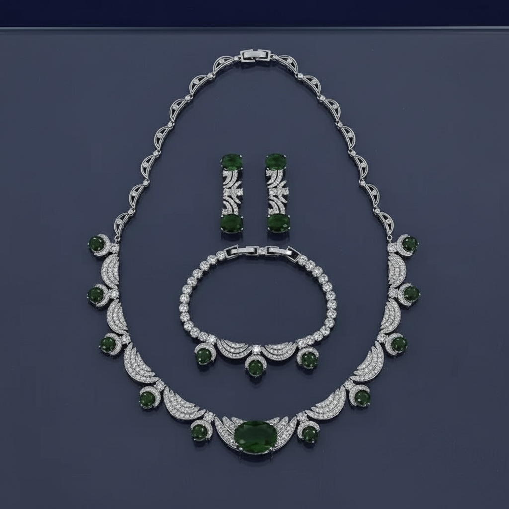 طقم مجوهرات فاخر باللون الفضي مرصع بأحجار كريمة خضراء داكنة وفصوص كريستالية براقة، يتكون من قلادة عريضة، وسوار، وأقراط بتصميم يجمع بين الرقي والفخامة