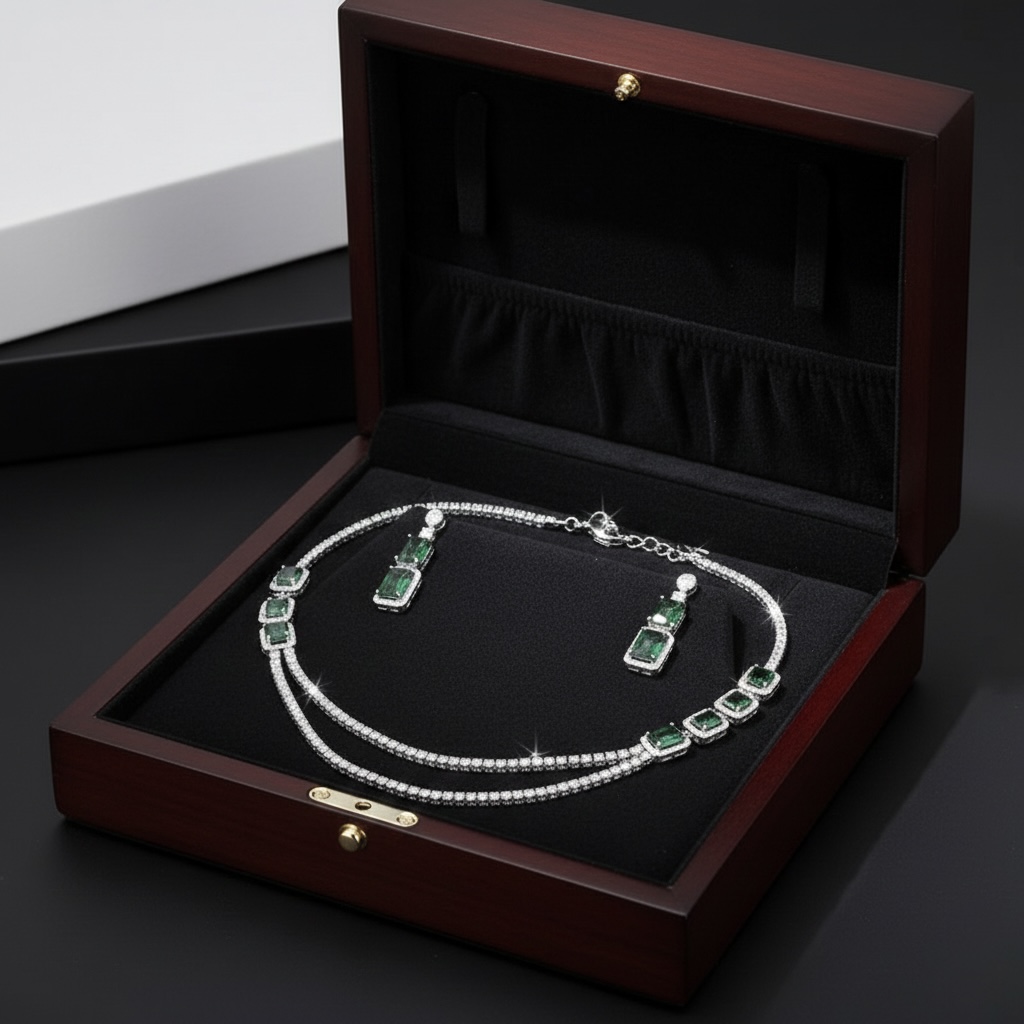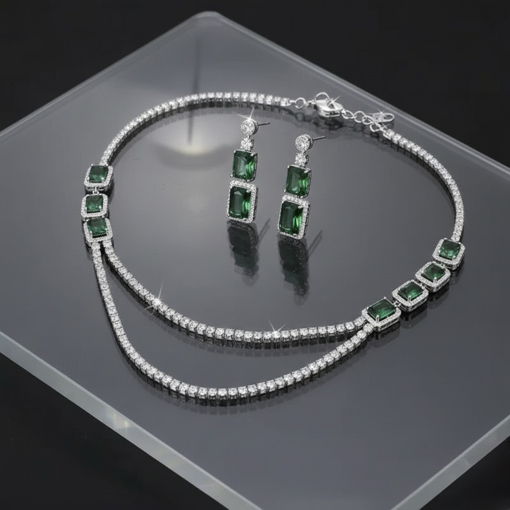 طقم مجوهرات فاخر باللون الفضي مرصع بأحجار زمردية خضراء مستطيلة وخطوط مزدوجة من الكرستال البراق