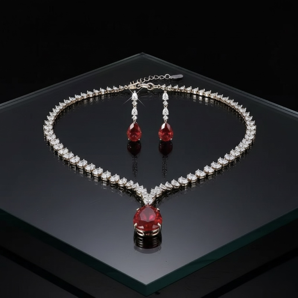 طقم مجوهرات فاخر يتألف من قلادة وأقراط متدلية، مرصع بصفوف من الزركون الأبيض المقطوع على شكل “كمثرى”، مع أحجار كريمة حمراء ضخمة وبارزة في المركز