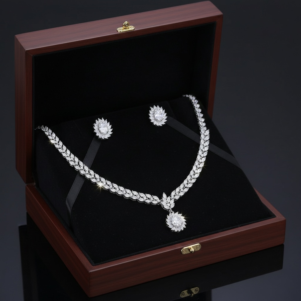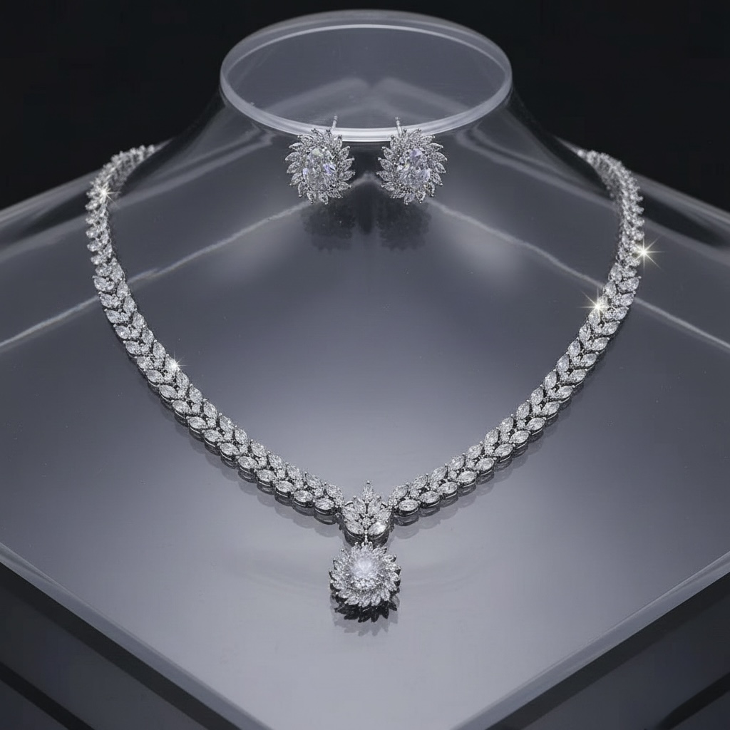طقم مجوهرات فاخر يتألف من قلادة وأقراط من الزركون اللامع، يتميز بتصميم كلاسيكي مرصع بفصوص ماركيز على هيئة أوراق شجر متصلة