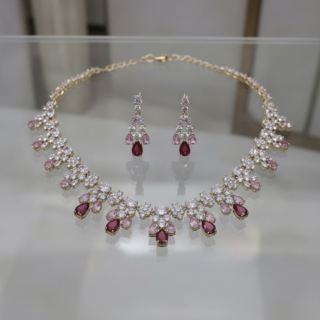 طقم مجوهرات فاخر يتألف من قلادة وأقراط متدلية، مرصع بأحجار كريمة بقطع تتدرج بين اللونين الأحمر الياقوتي والوردي، مع فصوص كريستالية بيضاء براقة بتصميم عنقودي جذاب على قاعدة مطلية بماء الذهب