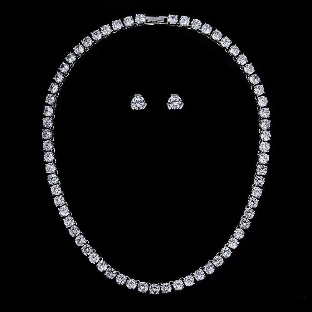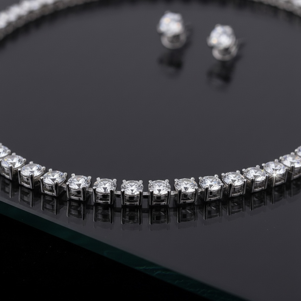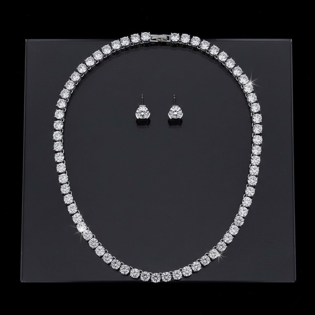 طقم مجوهرات فاخر يتكون من عقد “تنس” وأقراط دائرية، مرصع بصفوف متراصة من أحجار الزركون اللامعة بقطع دائري وتصميم كلاسيكي أنيق