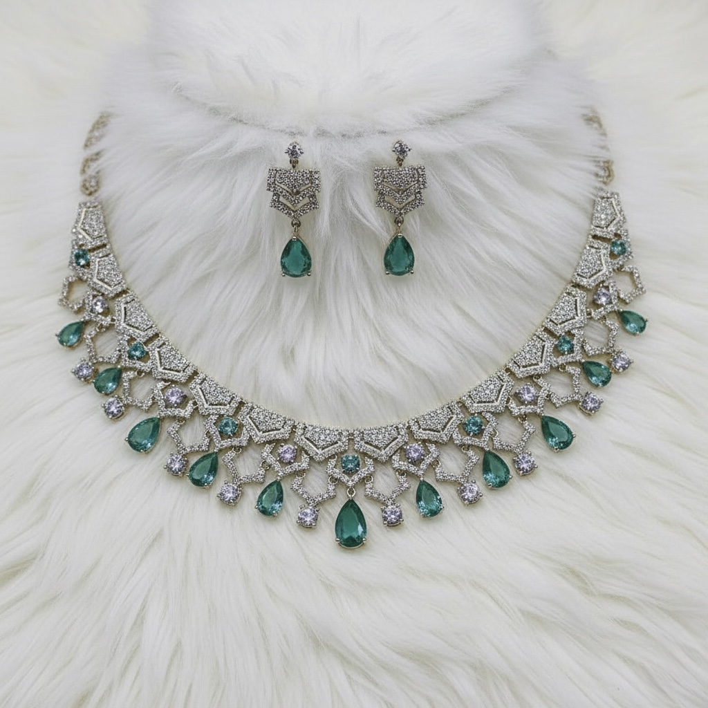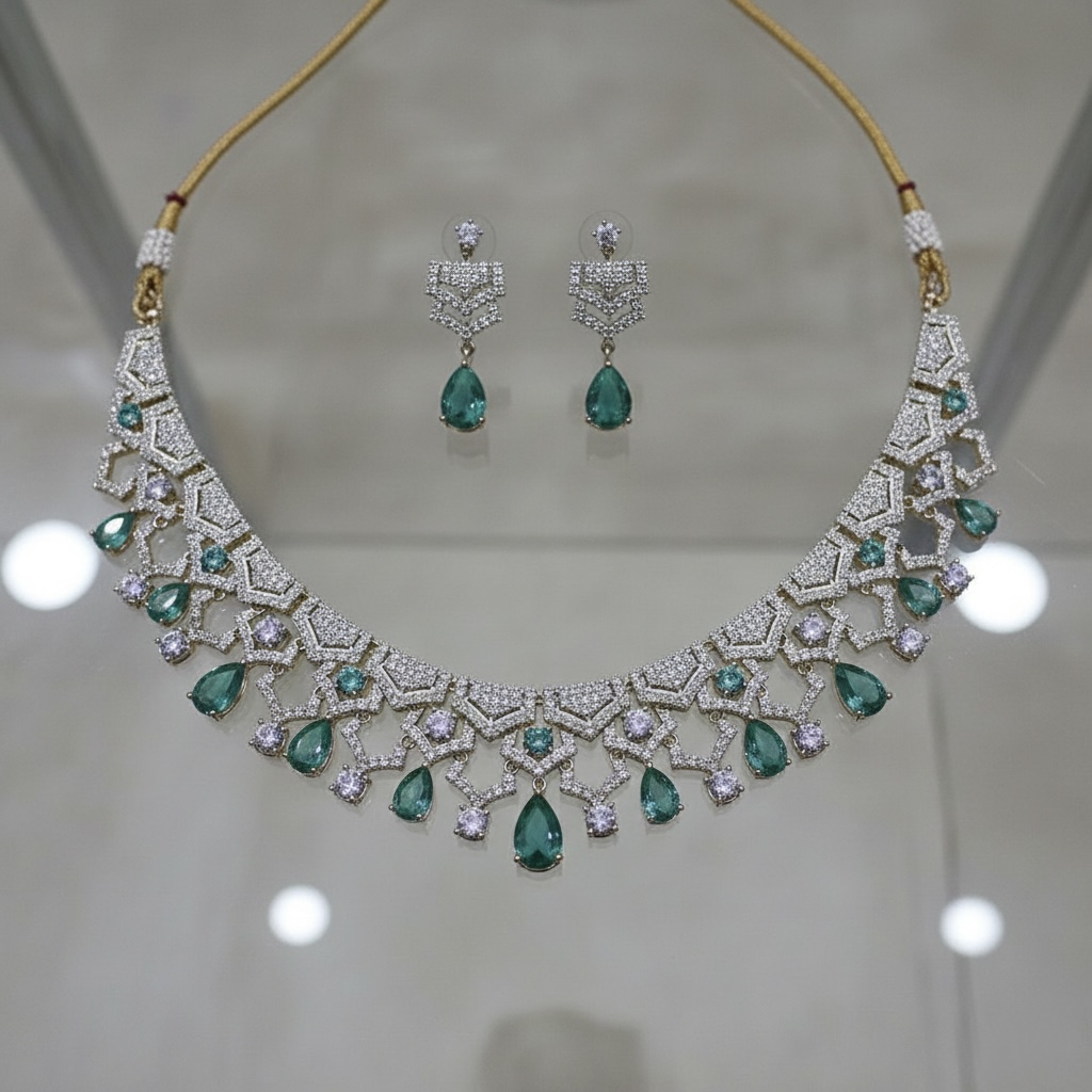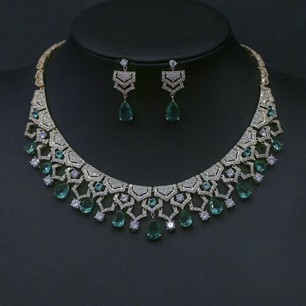 طقم مجوهرات فاخر يتكون من عقد وأقراط بتصميم هندسي مرصع بالزركون وأحجار الياقوت الأخضر المتدلية على شكل قطرات