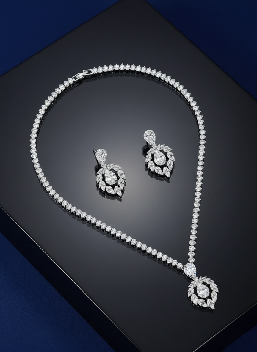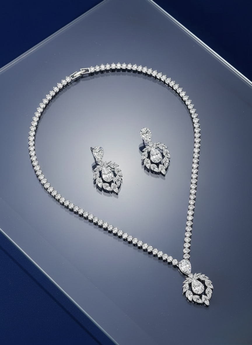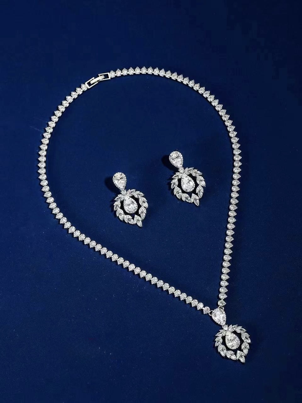 طقم مجوهرات فاخر يتكون من قلادة وأقراط، مرصع بأحجار على شكل “الكمثرى” و”الماركيز” بتصميم ملكي