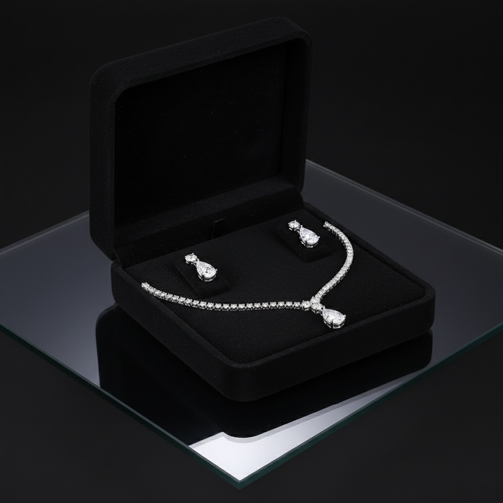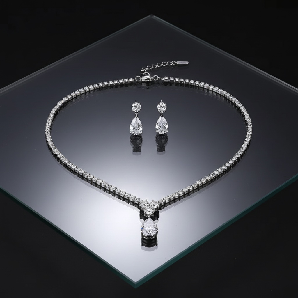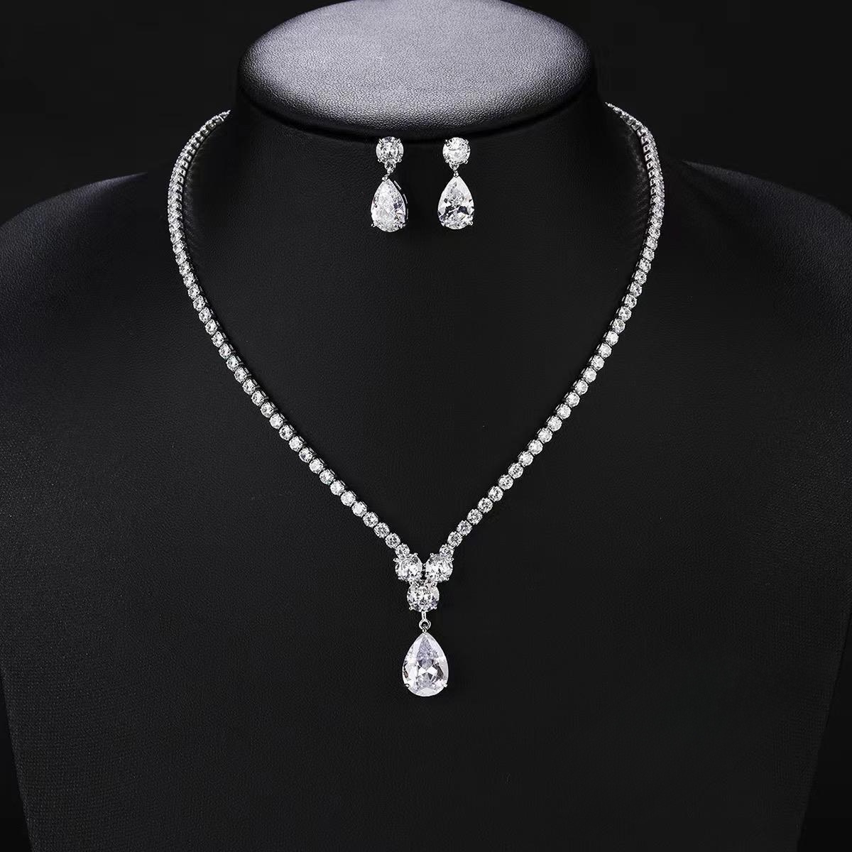 طقم مجوهرات نسائي فاخر يتكون من عقد “تنس” مرصع بأحجار كريستالية دائرية ينتهي بتدلية على شكل قطرة ماء (Pear Cut)، مع أقراط مطابقة بتصميم كلاسيكي أنيق